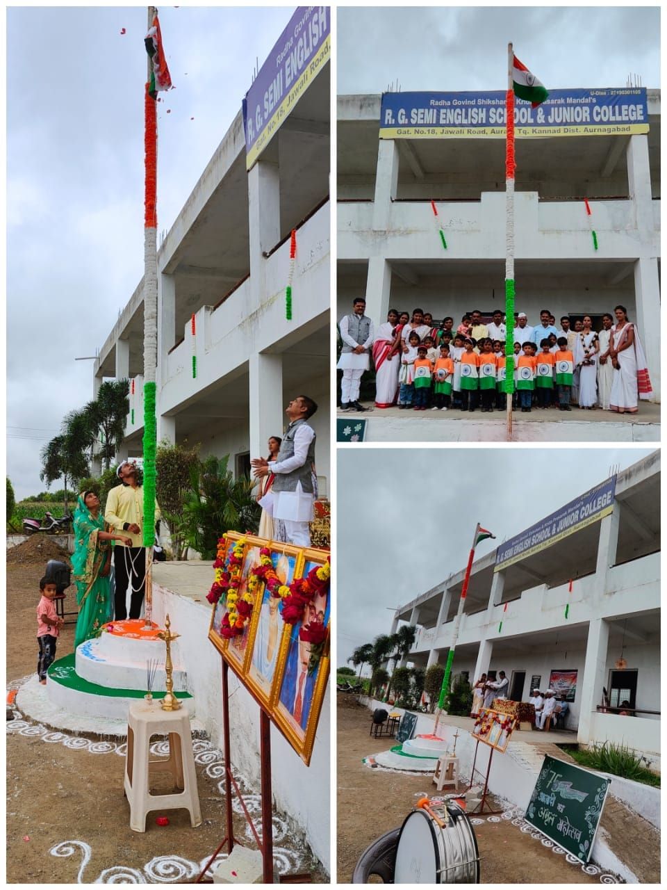 *आर. जि. पब्लिक स्कूल अॅण्ड ज्युनियर कॉलेज, औराळा येथे स्वातंत्र्याला 75 वर्षे पूर्ण होत असल्याच्या पाश्र्वभूमीवर स्वातंत्र्याचा अमृत महोत्सवा अंतर्गत "स्वराज्य महोत्सव" आज 76 व्या स्वातंत्र्य दिनानिमित्त अत्यंत उत्साही वातावरणात ध्वजारोहण करण्यात आले* *हे राष्ट्र देवतांचे, हे राष्ट्र प्रेषितांचे* *आचंद्रसूर्य नांदो,स्वातंत्र्य भारताचे.!!* _*अनेक ज्ञात-अज्ञात स्वातंत्र्यसेनानी आणि क्रांतिकारकांच्या त्याग आणि बलिदानातून आजचे स्वातंत्र्य साकारले आहे. आपण सर्वजण त्यांचे स्मरण करुयात.*_ *आज 15 ऑगस्ट, 2022 सोमवार रोजी आर. जि. पब्लिक स्कूल अॅण्ड ज्युनियर कॉलेज, औराळा येथे देशाच्या स्वातंत्र्यदिनानिमित्त अत्यंत उत्साही वातावरणात ध्वजारोहण करण्यात आले, आयोजित ध्वजारोहण कार्यक्रमात देशभक्ती पर गीत, नृत्य, कवायत तसेच आपले मनोगत व्यक्त करत विद्यार्थ्यांनी सर्वांची मने जिंकली. कार्यक्रमाच्या अध्यक्षस्थानी असलेले संस्थेचे संस्थापक अध्यक्ष श्री. गुलाबराव पा. जिवरख यांनी दीपप्रज्वलन तर पालक प्रतिनिधी श्री. राजेंद्र होलप यांनी यांनी सरस्वती पुजन केले. मा.ग्रामपंचायत सदस्य श्री. कैलास बागुल यांनी छ. शिवाजी महाराज यांच्या प्रतिमेचे व ग्रामपंचायत सदस्य श्री. राजेंद्रजी भारतीया यांनी राष्ट्रपिता महात्मा गांधी यांच्या प्रतिमेचे, पालक प्रतिनिधी श्री. मोहन बोरसे यांनी डॉ. बाबासाहेब आंबेडकर यांच्या प्रतिमेचे पूजन केले. संस्थेचे संचालक श्री. विकास जिवरख सर यांनी ध्वजपुजन तर कार्यक्रमास प्रमुख पाहुणे म्हणून लाभलेले पालक प्रतिनिधी श्री. ज्ञानेश्वर गायके व सौ. ज्योती गायके यांनी ध्वजारोहण केले.* *यावेळी संपूर्ण विद्यार्थी व पालक वर्ग, गांवकरी मंडळी मोठय़ा संख्येने उपस्थित होते.* *कार्यक्रमासाठी शाळेच्या मुख्याध्यापिका सौ. गीता जिवरख मॅडम यांच्या मार्गदर्शनाखाली पुजा जिवरख, ममता सपकाळ, आरती गायके, सरस्वती थोरात, आकांक्षा बुरकुल, जया सपकाळ, सानिया खान, राजेंद्र जिवरख, मुजाहीद शेख, अन्वर मण्यार, भरत साळुंके, महेश जिवरख यांनी परिश्रम घेतले.*